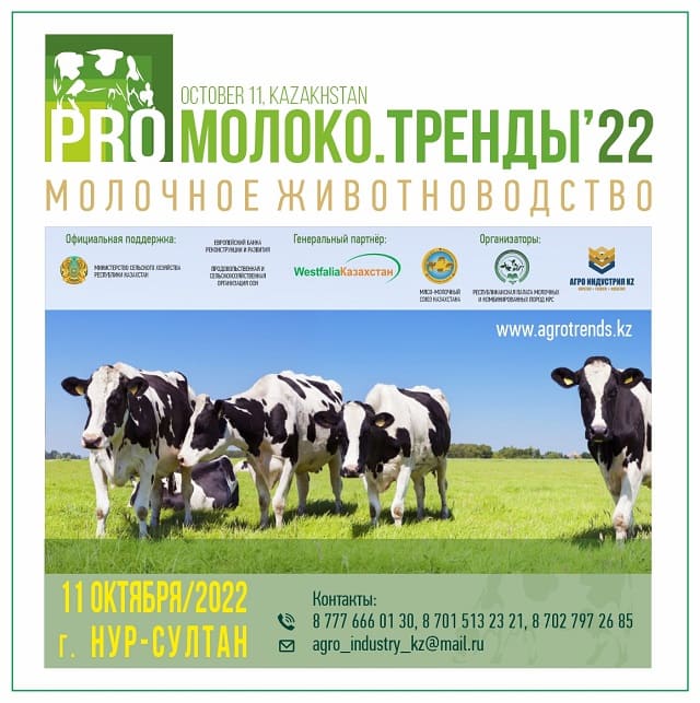 Вопросы молочного животноводства обсудят на Международном казахстанском форуме «PRO Молоко. Тренды‘22». Мероприятие подготовлено мясомолочным Союзом Казахстана и Палатой молочных и комбинированных пород КРС в партнерстве с ТОО Агро Индустрия KZ. При поддержки Продовольственной и сельскохозяйственной организации Объединённых наций и Европейского банка реконструкции и развития. Официальная поддержка Министерства сельского хозяйства РК, Генеральный партнер Форума — Westfalia Kazakhstan.